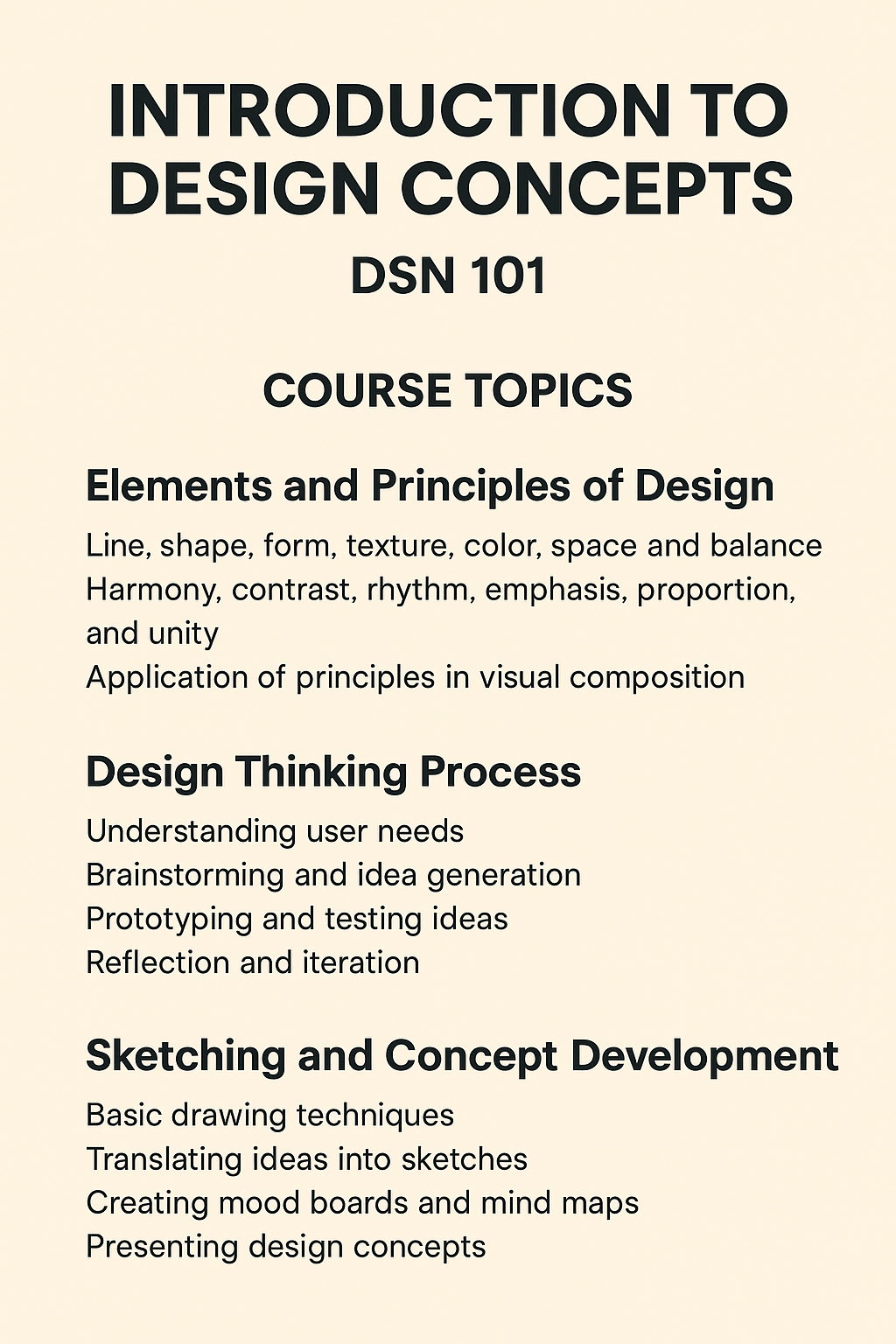 This course introduces learners to the fundamental principles, elements, and processes of design. It aims to develop creativity, critical thinking, and an understanding of how design shapes visual communication and product development. Learners will explore design through practical exercises and conceptual projects.